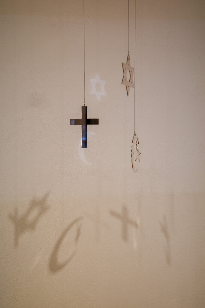 A marionette puppet with the three symbols of Abrahamic religions. Light spots and shadows of the symbols cast against the wall, the composition questioning faith and social structures (good and evil). Excellent example of a topic that seems more and more relevant with time passing.