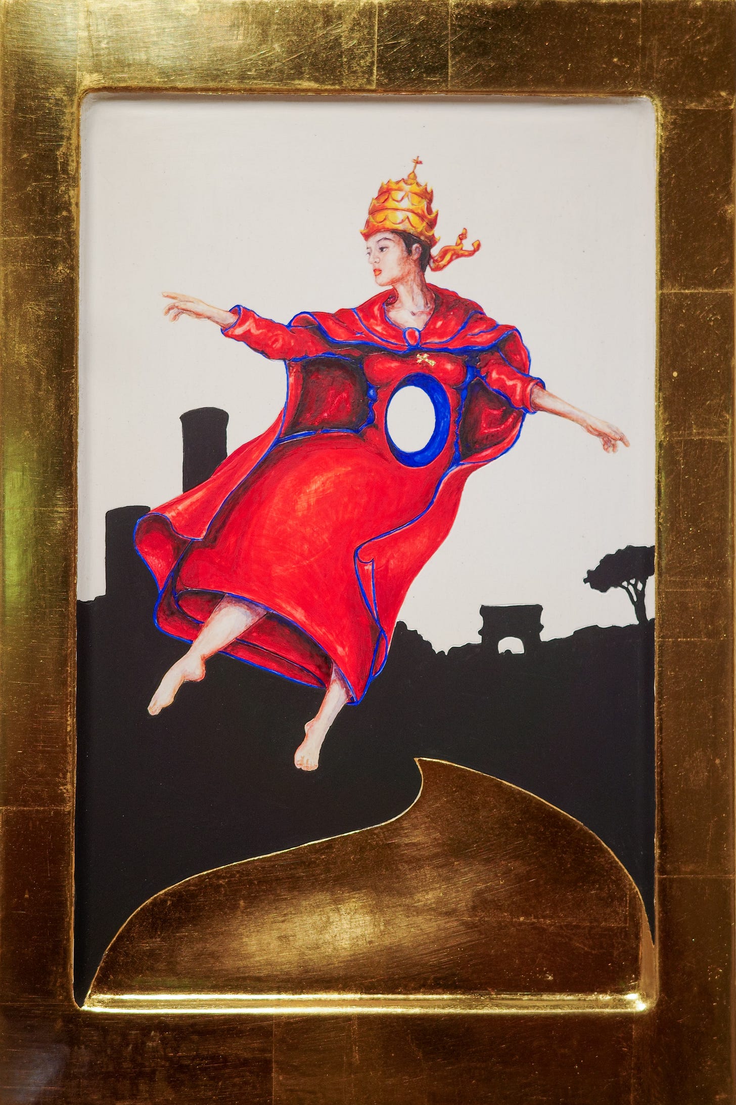 The story goes that Joan travelled to Rome and disguised herself as a man so she could study, she was so successful that she eventually became Pope! Until she gave birth during a religious procession along Via Sacra and was stoned to death. This whole idea is, of course, rejected as fiction by the Vatican. But Nicole canonises Pope Joan by depicting her as an icon. Gotta love a feminist move.
